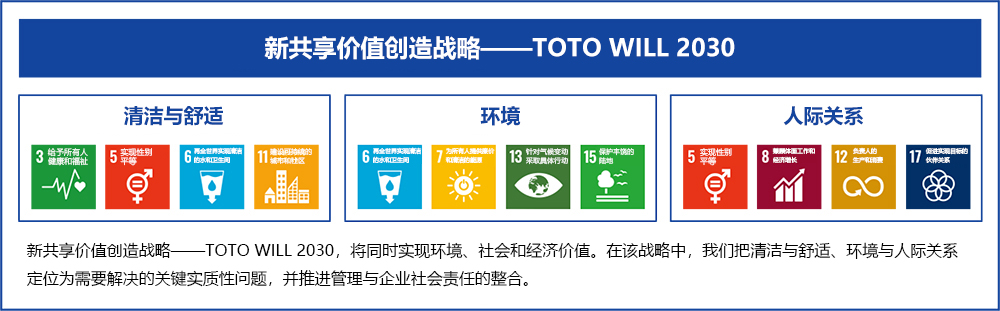 在2021年4月公布的新共享價值創造戰略--TOTO WILL2030中,TOTO集團將把清潔與舒適、環境與人際關系定位為需要解決的關鍵實質性問題,并推進管理與企業社會責任的整合。此外,新戰略還確立了“可持續產品”,即兼顧清潔、舒適和保護環境的獨特衛浴產品系列,TOTO將努力擴大這些產品的使用范圍,為發展有利于環境的豐富舒適的社會竭盡全力。TOTO還將通過其商業活動努力解決社會問題來實現經濟增長,并為實現聯合國可持續發展目標(SDGs)竭盡全力。