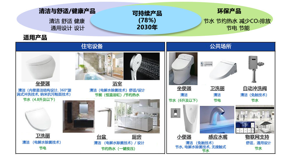 在新共享價值創造戰略——TOTO WILL 2030中,我們將TOTO的可持續產品定位為實現清潔與舒適以及保護環境的獨特TOTO產品。TOTO旨在2030年前,使可持續產品占其全球產品結構的78%。通過推動這些產品的廣泛采用,TOTO將幫助建立一個豐富舒適的社會,對全球化環境有利。