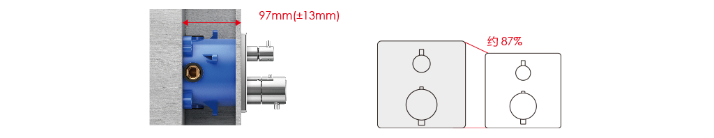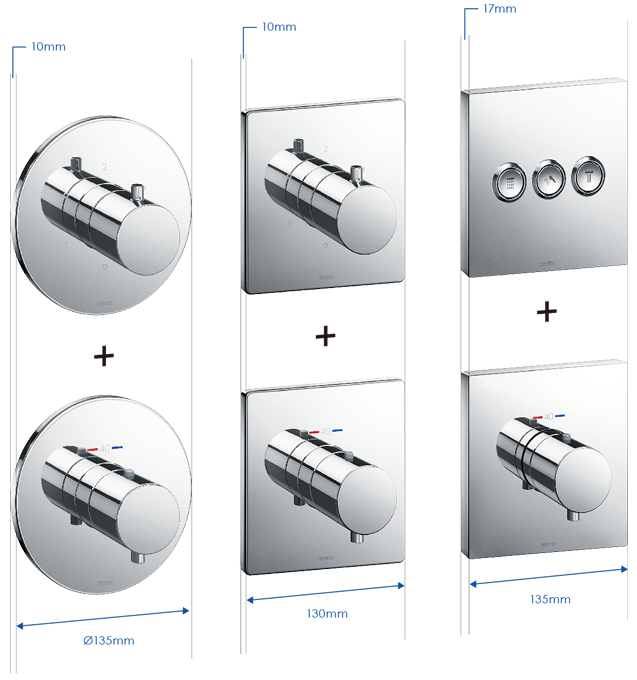 TOTO的MINI UNIT面板自由組合技術(shù),大幅提升安裝的自由度。 閥芯共通化設(shè)計(jì),埋墻的閥芯部分無(wú)需和外觀部件一 一匹配。 單柄式面板、恒溫式面板、按鍵式面板,你可根據(jù)自己喜好自由選擇,你更可按個(gè)人喜好選擇不同的產(chǎn)品外觀(圓形/方形) 。